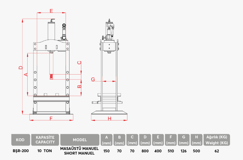 BŞR-200 10 Ton Masaüstü Manuel Pres, Başaran Hidrolik tarafından üretilen, 10 tona kadar baskı uygulayabilen, masaüstü tipi manuel bir hidrolik pres modelidir. Kompakt boyutları sayesinde dar alanlarda ve küçük atölyelerde kullanım için idealdir.